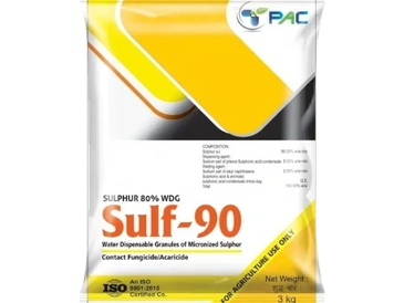 SULF-90 (Sulphur 80% WDG) used for the control of powdery mildew and scab on Grapes, Cowpea, Guar, Pea, Cumin, Apple & Mango Scab disease of apple. Sulf-90 is dry flow able water dispersible granules containing sulphur 80% w/w balance ingredients, the particle size range from 2 to 6 microns, thus displaying a fine layer of active ingredient on sprayed crop resulting in enhanced efficacy Sulf-90 plays an important role in a variety of plant function, including the cell wall. It maintains the structural and functional stability of the plant cell membrane. Sulf-90 helps in the movement of sucrose and energy in the growing parts of the plant and in the process pollination.